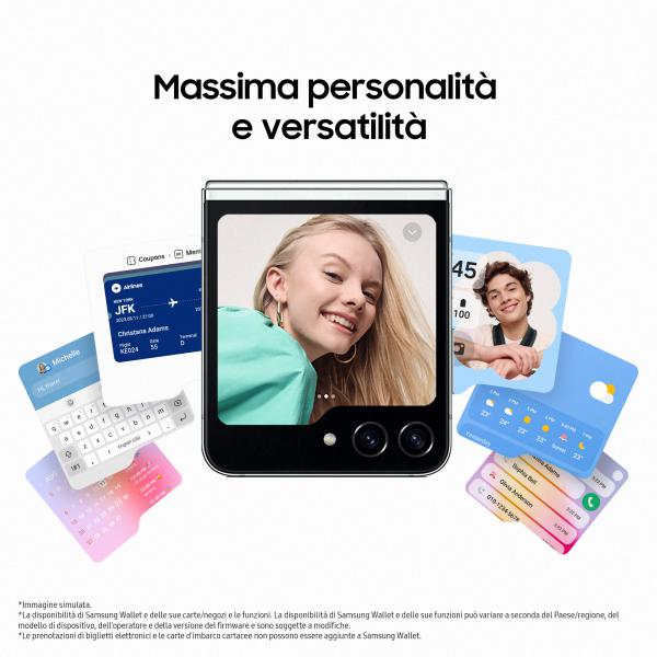 Scopri il nuovo impressionante Galaxy Z Flip5 dotato per la prima volta di Flex Window, il display esterno da 3,4''1 che ti permette di esprimere ogni giorno la tua personalità. Rispondi ai messaggi, chiama, controlla le previsioni meteo e paga, il tutto senza mai aprire lo smartphone. Con FlexCam ottieni selfie di gruppo perfetti da qualsiasi angolazione e scatti anche da lontano2 grazie alla funzione Controller Fotocamera3 di Galaxy Watch64. Trasforma Flex Window in un vero e proprio riflesso del tuo stile e della tua identità scegliendo tra i diversi widget, sfondi e quadranti orologio a disposizione.5 La nuova cerniera riprogettata con chiusura perfetta e il design portatile rendono Galaxy Z Flip5 più compatto e comodo da tenere in tasca6, per essere trasportato ovunque. Il potente Snapdragon® 8 Gen 2 Mobile Platform per Galaxy ti permette di sperimentare una grafica più fluida, portandoti ad un nuovo livello di potenza.7 È inoltre possibile dividere lo schermo in due per guardare uno spettacolo dal vivo sulla metà superiore dello schermo e leggere i commenti sulla metà inferiore. Galaxy Z Flip5 è con te sempre quando ne hai bisogno grazie alla batteria da 3700 mAh (tipica)8.